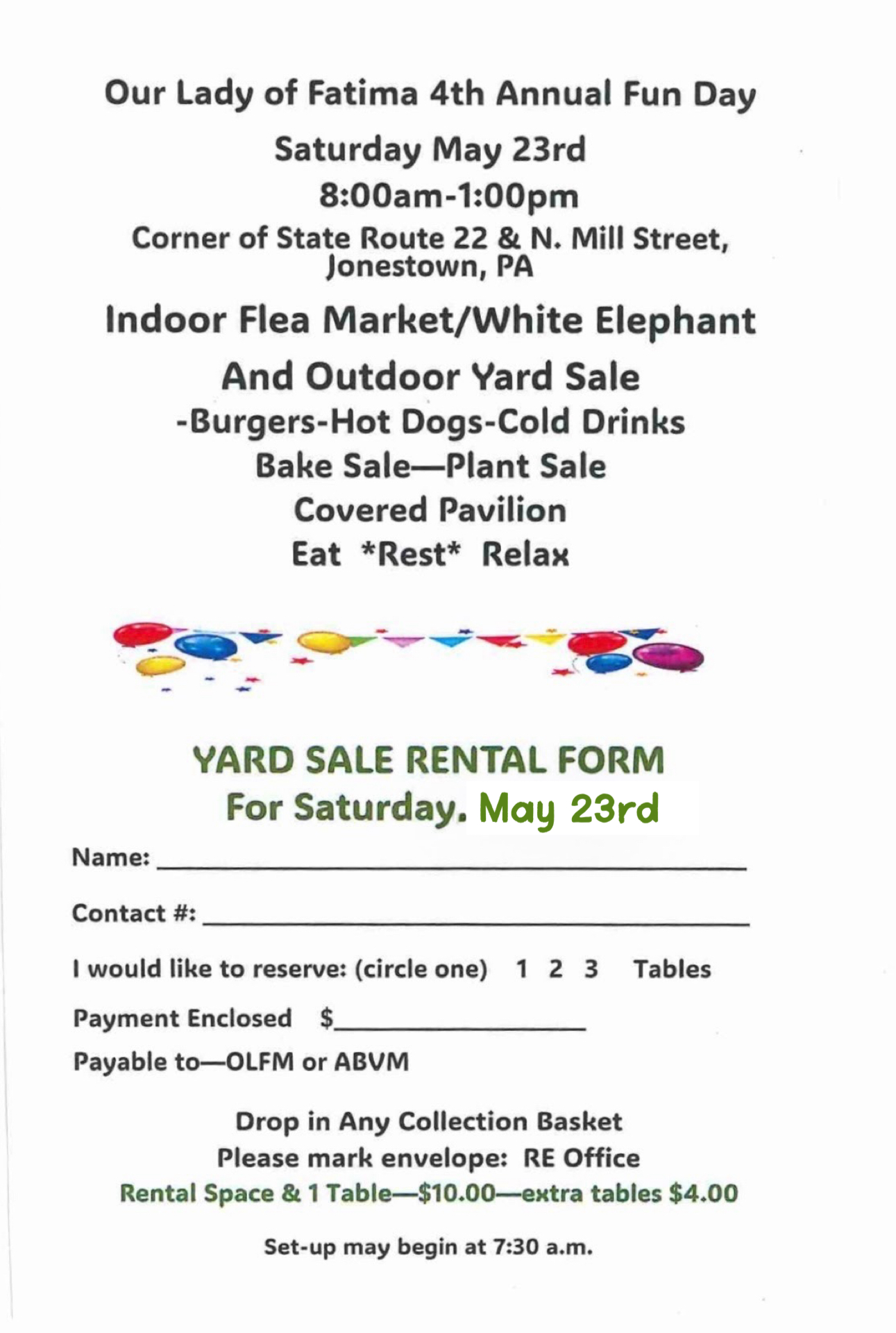 BUT…. If you, your family or friends would like to sell their own items, including clothing at our yard sale and put a little jingle in your pocket, rental space with tables are available. Each rental space includes one 6′ table set up on prime location, the front yard and front parking lot. All this for a bargain of $10.00. Additional tables are available-$3.00 each.
