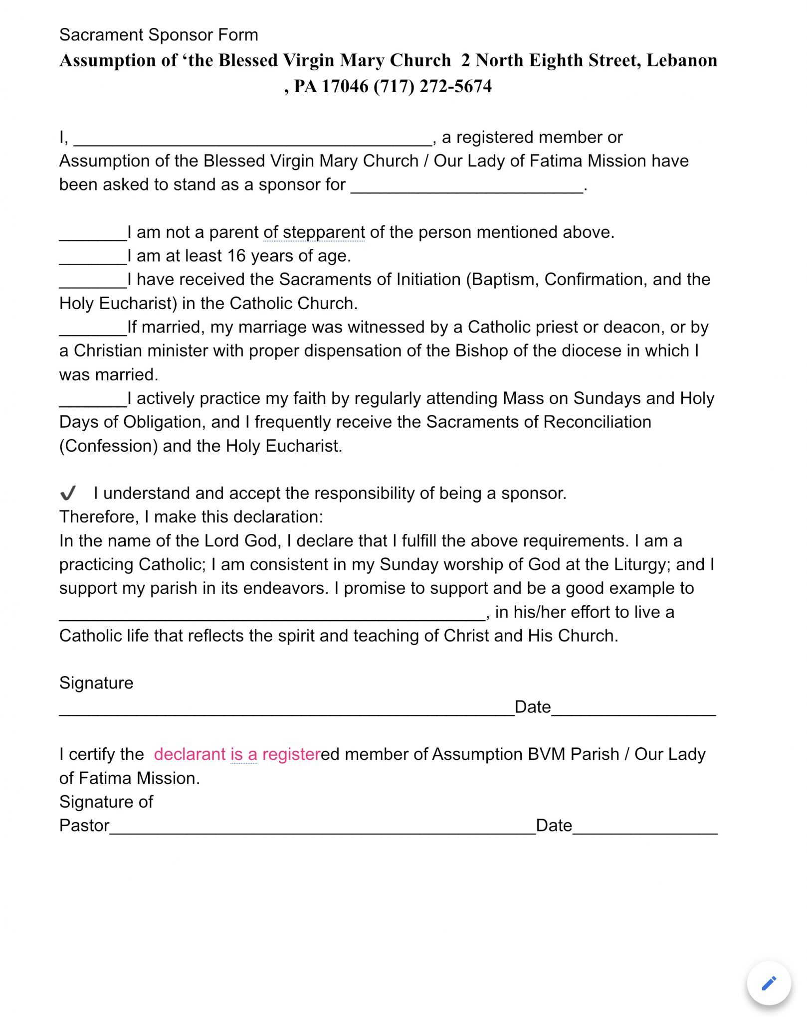 Printable Form. Not online… Sacrament Sponsor Form Please click on the above blue link to print out the form and submit to the parish office at the address at the top of the form. ⬆️